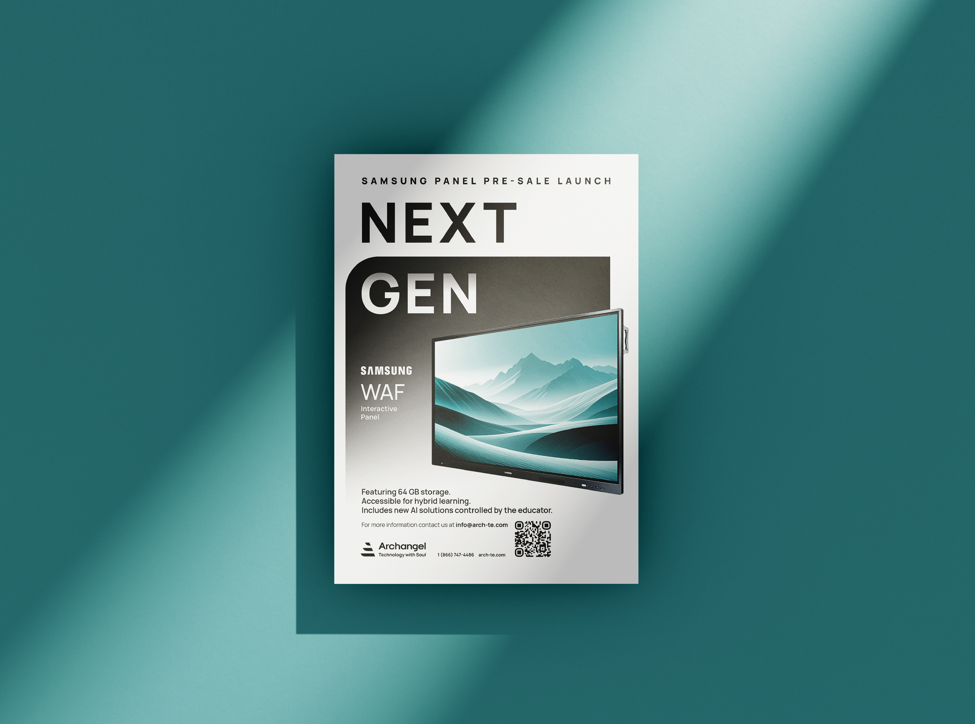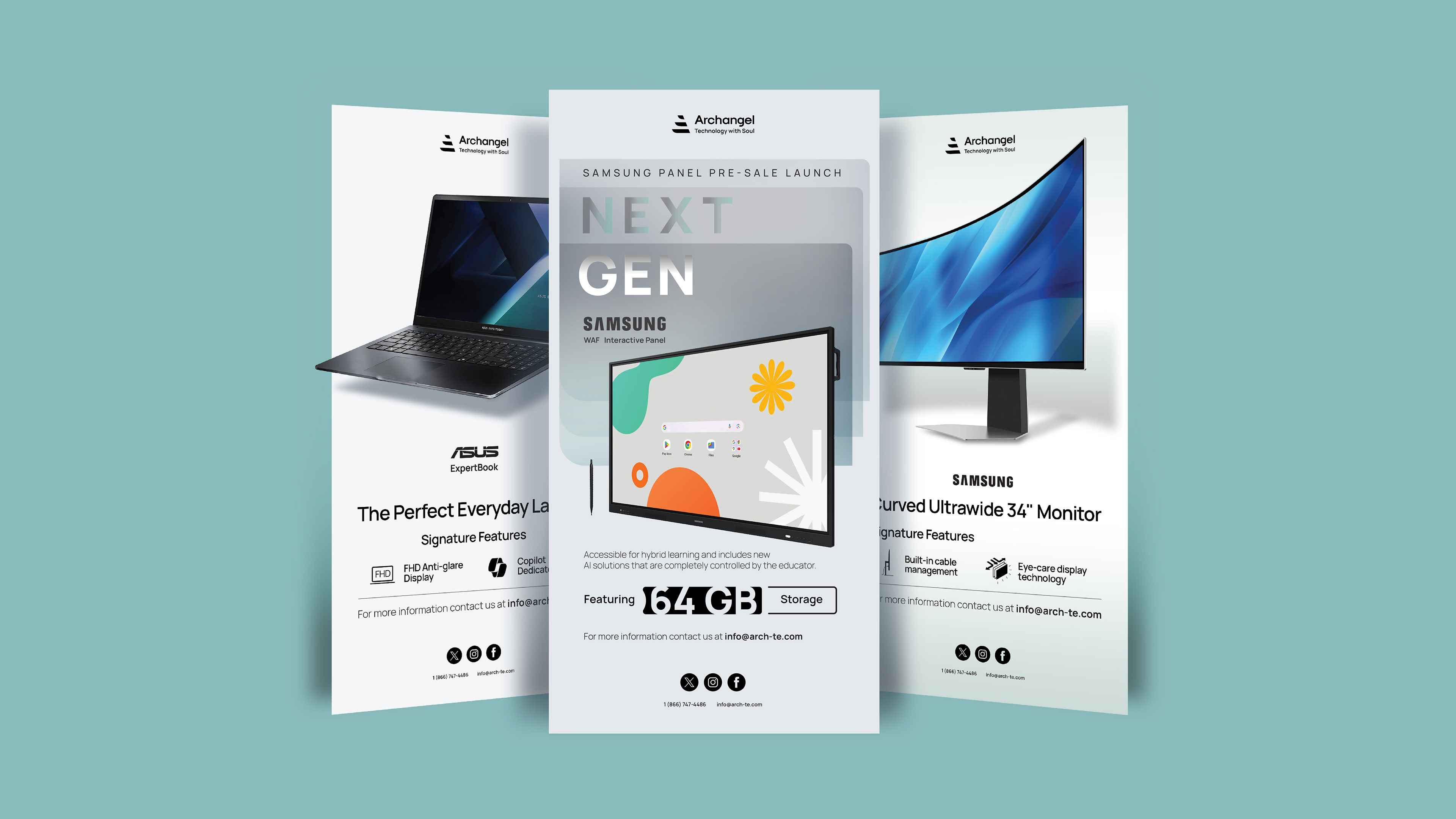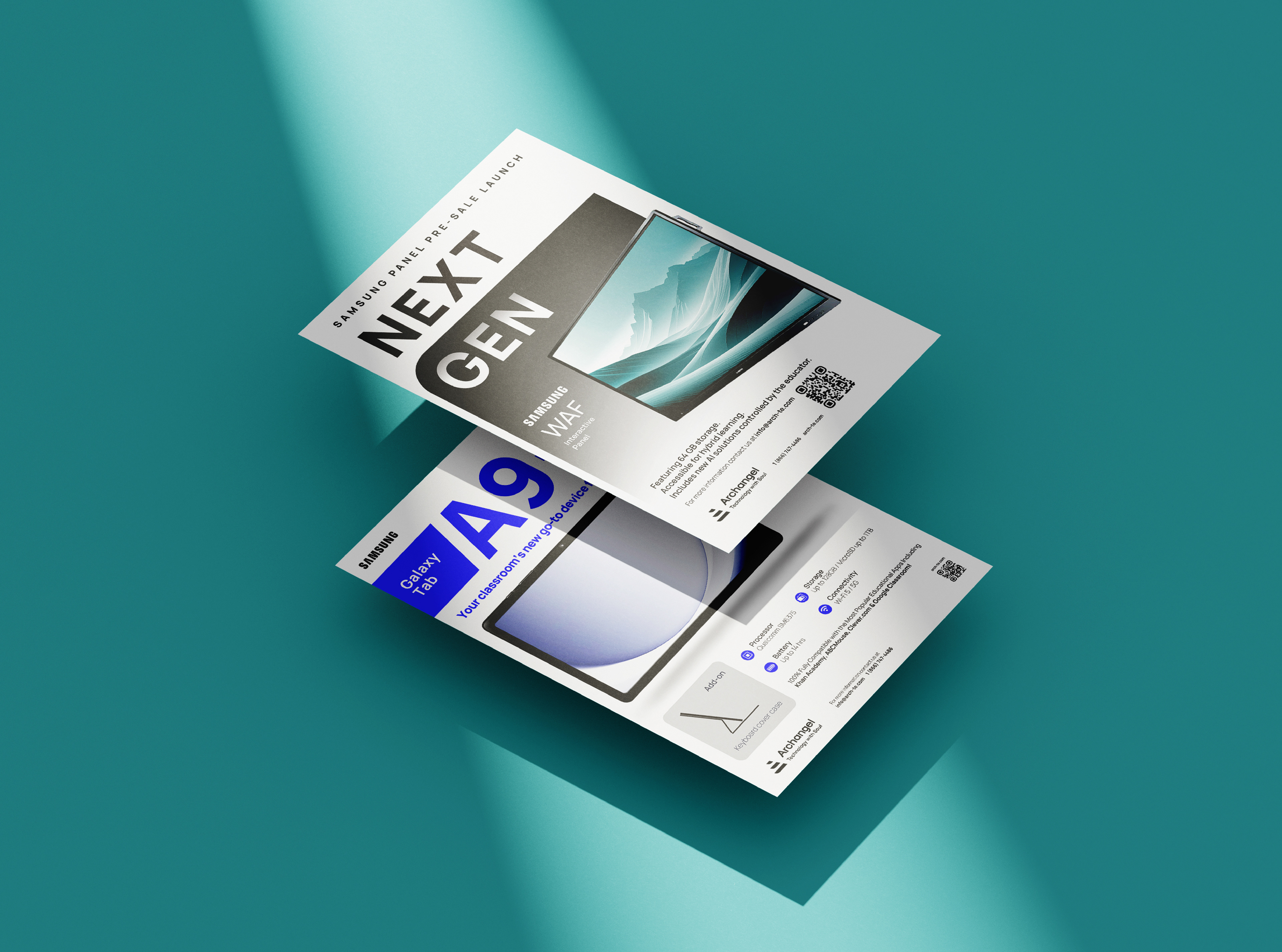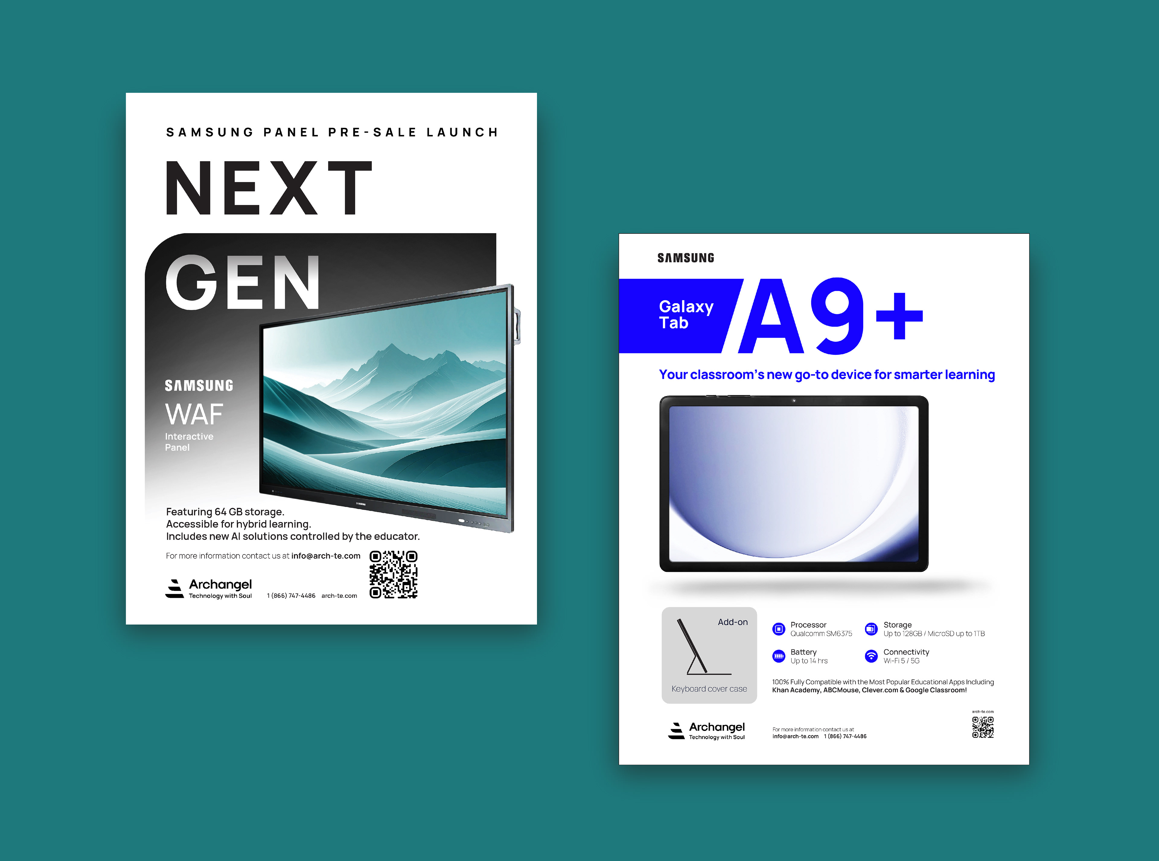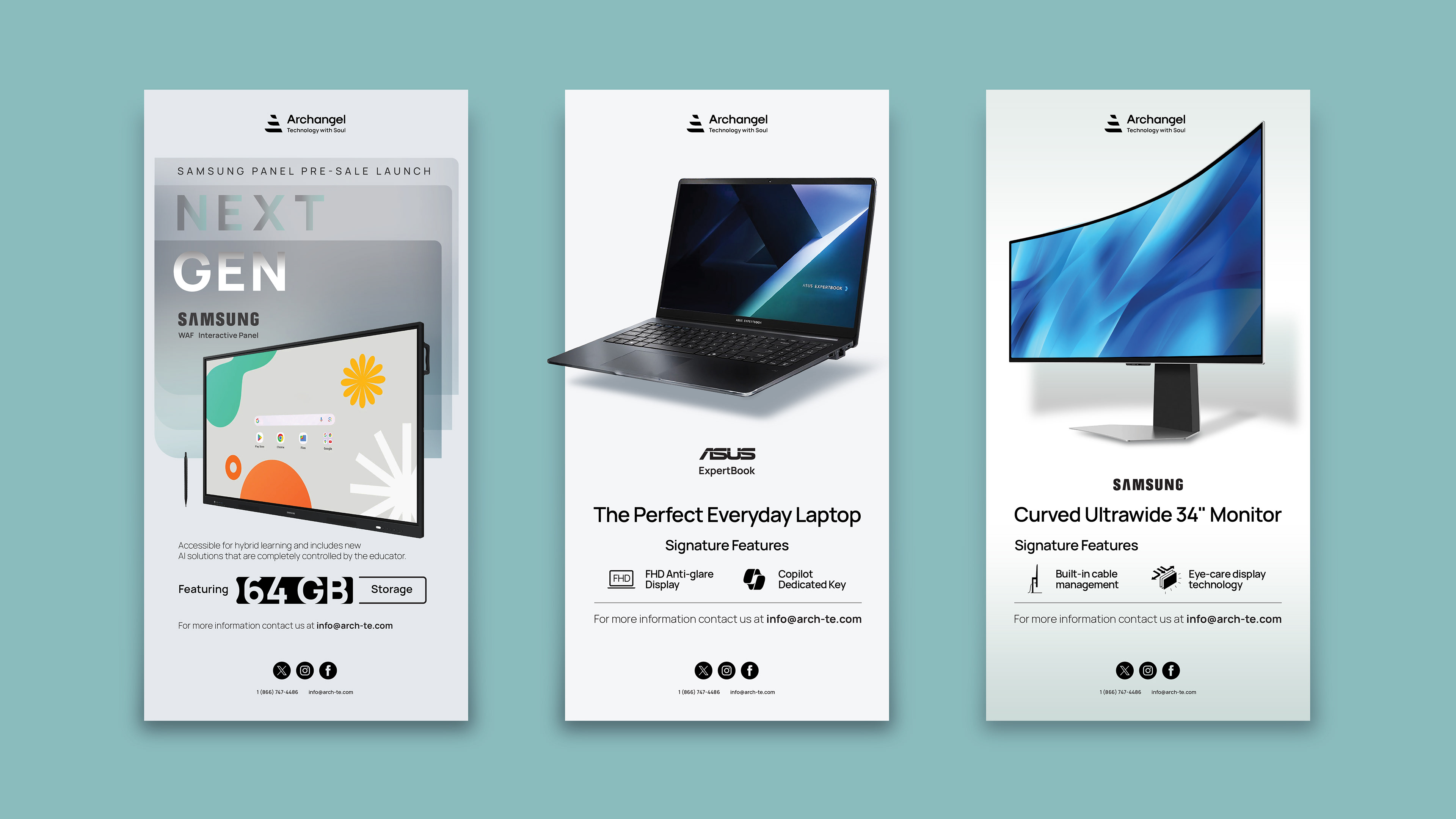A promotional design system developed for Archangel Education & Technology, focused on marketing consumer technology products through clear, scalable layouts.